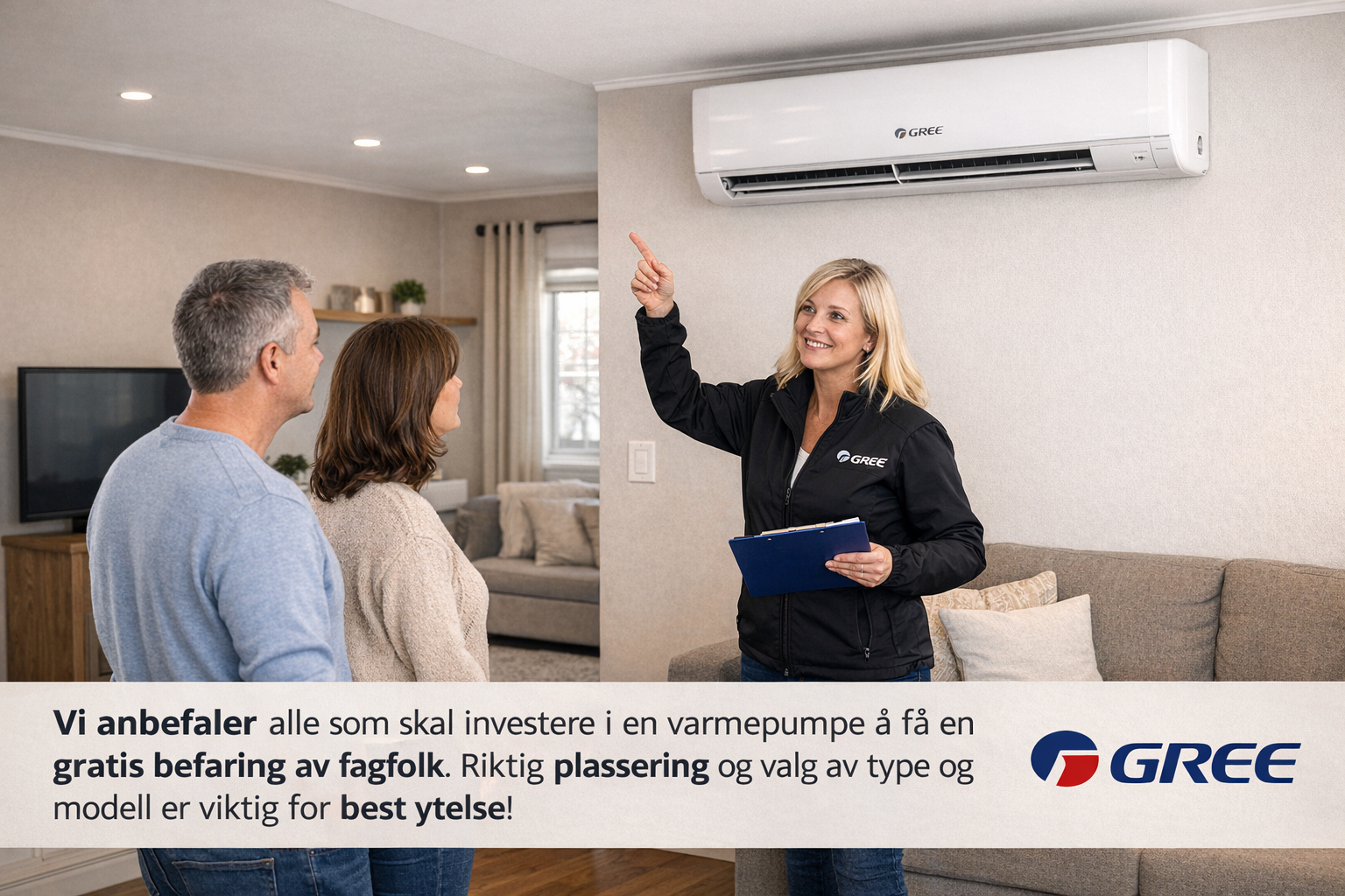 Vi anbefaler alle som skal investere i en varmepumpe å få en eller flere fagfolk på besøk for en gratis befaring. Riktig plassering av innedelen er svært viktig for å få maksimal ytelse ut av varmepumpen og dette trenger ikke alltid å være like opplagt. Du får også en rekke råd på hvilke type, merke og modell som passer best til ditt behov.